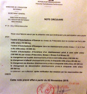 Dorénavant, l’octroi d’autorisation d’exercer et celle d’enseigner sera payant à partir de lundi prochain. De même pour l’attribution d’autorisation d’ouverture d’un établissement scolaire – 100 000 ariary par niveau -, le changement de localité, le changement d’effectif, le changement de direction ou encore le changement de dénomination, la participation exigée par la Dren Analamanga varie de 50 000 à 100 000 ariary. En somme, l’éducation nationale devient une … machine à sous !