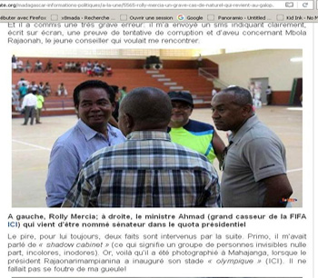 Jeannot Ramambazafy a sorti sur son site Madagate, le samedi 6 février 2016, un dossier de témoignage sur les tenants de ses récents derniers contacts avec Rolly Mercia, ancien journaliste et politicien. Dans cet article, le premier a apporté ses preuves sur la tentative du second de le convaincre à s’allier au régime Rajaonarimampianina. Une proposition que le rédacteur a refusée, selon ses propos. L’intégralité de ce dossier peut être vue sur le site www.madagate.org.