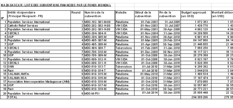 Le Fonds Mondial a commencé à financer les stratégies nationales de lutte contre le sida, la tuberculose et le paludisme à Madagascar depuis 2003. A ce jour, le montant du budget approuvé est de 284 millions de Usd dont 279 millions de Usd sont déjà déboursés au Pays. Ces fonds débloqués ont servi au traitement de plus de 13 millions de cas, tous confondus. Le tableau ci-après résume les financements faits par subvention et par maladie (subventions clôturées et en cours).