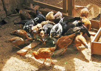 Pour l’alimentation, l’éleveur doit veiller à un équilibre dans la mesure du possible, des rations des poussins. Les aliments seront broyés. Il doit veiller à l’apport protéinique par des poudres de poisson, des vers de terre ou termites. Si les céréales sont insuffisantes, il peut utiliser en compléments les tubercules (manioc, patate douce). La distribution se fait tôt le matin à l’ouverture du poulailler, début d’après midi et en fin d’après-midi à la fermeture du poulailler.