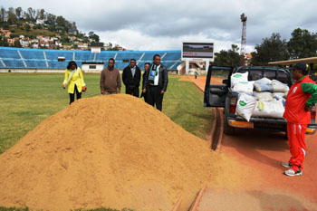 La pelouse du stade Mahamasina doit répondre à plusieurs exigences techniques. Ainsi, toutes les instances sportives utilisatrices du terrain s’engagent pour apporter leur contribution à la réhabilitation du stade. En vue de l’organisation de la Coupe d’Afrique des Nations Groupe B, qui se tiendra dans le pays du 12 au 19 juin prochains, le Malagasy rugby a fait de dotation à la Commune Urbaine d’Antananarivo (Cua) pour accélérer les travaux de rénovation de la pelouse de Mahamasina. Tandis que la ligue d’Analamanga du football a déjà offert des matériaux d’arrosages sophistiqués pour le terrain. Dans ce sens dix sacs de ciment, 350 kg d’engrais et 45 mètres cube de sable de rivière. Ce dernier servira à épandre sur toute la surface de la pelouse pour éviter que les trous néoformés ne se rebouchent trop vite et d’autres pour réhabiliter les canaux d’évacuation. « La date de la compétition avance à grands pas. Et le terrain qui abritera la rencontre est encore loin de sa finalisation. Le stade de Mahamasina est le seul et unique terrain homologué par l’instance internationale de rugby pour abriter la coupe d’Afrique. Ainsi, le Malagasy rugby apporte ses dotations à la Cua pour accélér l’avancement des travaux », annonce Marcel Rakotomalala, président du Malagasy Rugby lors de la remise des dons ce matin aux responsables de l’entretien du stade. Depuis la fermeture du stade, toute grande rencontre de football a été déplacée à Mahajanga à défaut d’autres infrastructures dans la Capitale. En parlant du rugby, prévue se tenir au stade d’Alarobia le 29 mai prochain, la Coupe des Clubs de l’Océan Indien, qui opposera le Ftm Manjakaray à l’équipe de Saint-Pierre La Réunion et le Mayotte contre Mahajanga, sera délocalisée au Stade Makis Andohatapenaka. Alarobia abritera le championnat régional d’Athlétisme Analamanga.
