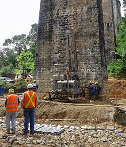 Les travaux en cours de réparation du viaduc de Sahasinaka font appel à des méthodes à haute technicité de reprise en sous-œuvre. Elles consistent à combler, jusqu’à 22 m de profondeur, le vide des massifs de fondations avec la technique d’injection de coulis. Ce travail nécessite au préalable la constitution d’une cage étanche dans le sol autour de l’ouvrage, permettant la mise en pression des injections. L’injection se fait en dessous de chacun des piliers P10, P11, P12, P13 de l’ouvrage avec des coulis d’argile-ciment ou de mortiers fins fluides. Le chantier comprend aussi des travaux de colmatages de fissures en travées risquant de compromettre la stabilité des voûtes. Ces travaux à grande hauteur feront appel à des cordistes.