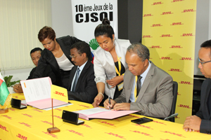Dhl, le leader mondial de transport express, hérite du titre de partenaire logistique des Jeux de la Commission de la jeunesse et des sports de l’Océan Indien (Cjsoi). Au niveau mondial, Dhl assure la logistique de nombreux événements sportifs tout comme à Madagascar. L’engagement de Dhl encourage le développement personnel des jeunes pour le développement du sport, qui n’a pas de limite. Il faut tout faire, étape par étape, en devenant champion des quartiers pour commencer jusqu’à atteindre le niveau mondial. C’est pareil pour les entreprises. On ne peut pas devenir une grande entreprise, si on ne s’entraîne pas pour dépasser ses limites tous les jours. C’est universel, car les choses ne se font pas du jour au lendemain.« Coopérer avec la Cjsoi semblait une évidence car nous voulons apporter notre bien à la jeunesse malagasy et pour le sport qui est la base de l’Education », a déclaré le Dg de Dhl Madagascar, Mamy Rakotondraibe, lors de la cérémonie de signatures des conventions de partenariat entre le président de la Cjsoi et la société. Pour Yves Andrianaharison, le Directeur commercial « Dhl s’engage à aider toute manifestation locale et à promouvoir le sport. Nous avons tous grandi avec le sport et c’est un honneur de faire partie de cette aventure ». Jean Anicet Andriamosarisoa, Président en exercice de la Cjsoi, ministre de la Jeunesse et des Sports malgache : « C’est un grand plaisir d’accueillir Dhl Madagascar en tant que partenaire logistique. Nous avons envoyé beaucoup de dossiers à certaines entreprises mais Dhl est le premier à réagir à s’engager avec nous. Ce partenariat va nous aider à organiser ces jeux dans les meilleures conditions. L’aide fournie par l’entreprise est inestimable et nous espérons préserver cette alliance encore pendant de nombreuses saisons ».