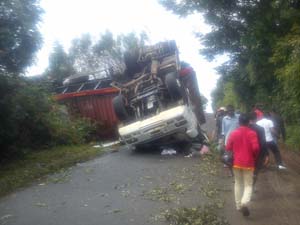 Un camion semi-remorque a subi un grave accident hier sur la route nationale 5 à 60 kilomètres de Sambava. En plus du conducteur, une femme dormait dans la cabine du véhicule. Cette dernière a été décédée au moment du choc ; le chauffeur quant à lui n’a eu que quelques blessures. En effet, il avait réussi à se dégager en vitesse, mais la femme était restée bloquée sous le poids du véhicule. Le corps inerte et sans vie de la défunte était toujours dans la même position une heure après le drame. D’après les informations reçues, il s’agissait d’une semi-remorque qui se trouvait près d’Antsirabe-Nord. Le véhicule avait brusquement désamorcé, suite à un problème technique, ce qui l’avait conduit à faire automatiquement marche arrière. A ce moment-là, les charges de la remorque avaient pesé lourd ce qui a entraîné la chute inévitable du camion. Celui-ci avait fait plusieurs tonneaux avant de se retrouver les quatorze roues en l’air. D’après les dires des témoins oculaires, la moitié du corps de la victime se trouvait hors du véhicule tandis que l’autre moitié était restée à l’intérieure.
