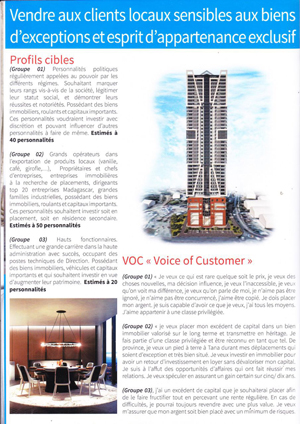 Selon toujours le document confidentiel, ces personnalités politiques, principaux profils cibles du projet, devraient raisonner comme suit« je veux ce qui est rare quel que soit le prix, je veux des choses nouvelles, ma décision influence, je veux l’inaccessible, je veux qu’on voit ma différence, je veux qu’on parle de moi, je n’aime pas être ignoré, je n’aime pas être concurrencé, j’aime être copié. Je dois placer mon argent, je suis capable d’avoir ce que je veux, j’ai tous les moyens, j’aime appartenir à une classe privilégiée ».Cette vérité bien malgache, tristement célèbre, selon laquelle la politique est la source de richesses la plus fiable tend ainsi à se confirmer. Les prix proposés sont scandaleusement élevés, 500.000 euros pour un appartement de 4 pièces faisant au total 178m2, et 380.000 pour un appartement de deux pièces, totalisant 108m2. Au dernier étage se trouveront « 2 penthouses » de 280m2, au prix de 1.000.000euros de chaque.