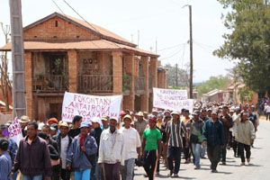 Des habitants de Soamahamanina ont manifesté le long de la route nationale n°1 depuis le mois de février car la majorité d’entre eux refuse un projet d’exploitation aurifère qui menace de destruction leur village, leur environnement et leurs sources de revenus. Mais au mois de mai, le permis environnemental, dernière étape avant la délivrance de l’autorisation de débuter les opérations d’extraction, a été approuvé par l’Office national de l’environnement, et la société Jiuxing Mines Sarl s’installe avec ses engins et ses employés. La contestation des habitants prend de l’ampleur, et au mois de juin survient la création de l’association Vona Fitiavan-tanindrazana, bénéficiant du soutien de nombreux citoyens, structures et organisations de la société civile. Les manifestations sont réprimées et aboutissent à l’emprisonnement, en septembre, de 5 citoyens pendant plusieurs semaines. Le procès s’est tenu en novembre, grâce notamment à l’intervention du rapporteur spécial des Nations Unies pour les droits de l’homme et l’environnement, John Knox, en mission à Madagascar. Le verdict a été d’un an d’emprisonnement avec sursis pour avoir manifesté sans autorisation, les détenus ont été acquittés pour les autres motifs d’inculpation.
