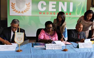 La Commission électorale nationale indépendante et le gouvernement malagasy ont procédé, hier, à la signature du projet de « Soutien au cycle électoral de Madagascar » (Sacem) avec la Communauté internationale emmenée par le Système des Nations Unies à Madagascar. Une cérémonie qui a vu la présence du Premier ministre Olivier Mahafaly, de la Représentante résidente du Programme des Nations Unies pour le développement et en même temps Coordonatrice résidente du Système des Nations Unies à Madagascar, Violette Kakyomya, du représentant de l’Union européenne et de quelques opposants au régime actuel. Ce projet concrétise un nouveau cadre de collaboration entre la Communauté internationale et Madagascar en vue des élections à venir. En outre, le projet Sacem permettra l’encadrement et le pilotage de l‘assistance électorale, mais également cherchera à renforcer les capacités de la Ceni. Le Sacem touchera à cinq domaines bien définis, dont l’appui à la crédibilisation de la liste électorale, la révision du cadre légal des élections, la communication et l’éducation civique électorale, l’appui aux opérations électorales et enfin une assistance technique de la Ceni. Autant dire les activités déjà menées par la Ceni depuis un certain temps.