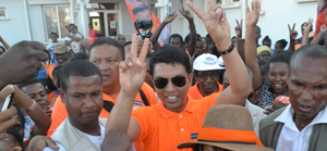 Heureuses retrouvailles entre l’ancien président de la transition et la population d’Antsiranana. Celle-ci a battu le record du plus grand nombre d’habitants réunis dans le centre ville. Depuis l’aéroport d’Arrachart jusque devant le cinéma Ritz, le président national du MAPAR a été accueilli par la quasi-totalité de la population antsiranaise. Escortés par des centaines de voitures habillées de la couleur orange, Andry Rajoelina et le candidat à la mairie d’Antsiranana ont démontré que le MAPAR est l’unique favori dans ces élections du 31 juillet. D’ailleurs, Rajoelina a carrément déclaré que voter les candidats MAPAR reste la solution la plus fiable pour guérir tous les maux qui frappent cette ville.
